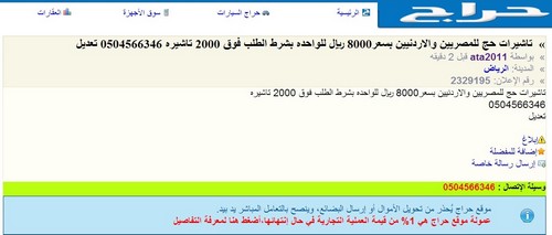 رصدت “المواطن” إعلاناً عبر موقع “حراج” الإلكتروني نشر فيه أحد الأشخاص إعلاناً يوضح فيه بيع تأشيرات للجنسيتين المصرية والأردنية، بمبلغ 8 آلاف ريال، وعنونه بـ”تأشيرات حج للمصريين والأردنيين بسعر8000 ريال للواحدة، بشرط الطلب فوق 2000 تأشيره”.