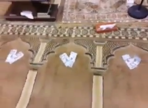 وأظهر الفيديو عدداً من المبالغ الموضوعة بجوار إمام المسجد داخل محرابه.