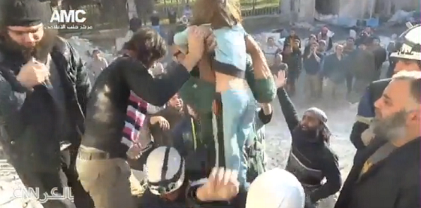 نشر نشطاء سوريون مقطع فيديو -قيل في وصفه إنه- يرصد عملية إنقاذ طفلة من تحت الأنقاض، بعد قصف مدينة حلب السورية ببراميل متفجرة.