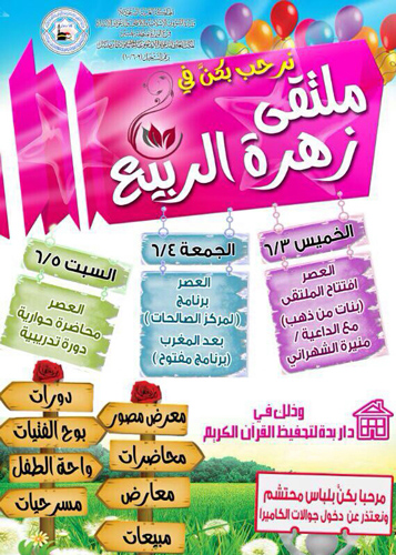 تقيم دار بدة النسائية التابعة لمكتب إشراف حلقات تحفيظ القرآن الكريم بوادي ابن هشبل الخميس المقبل ملتقى زهرة الربيع، لمدة ثلاثة أيام، وسيشتمل الملتقى على البرامج التالية: محاضرات – معرض مصور – معارض – مبيعات – دورات – بوح الفتيات – واحة الطفل – مسرحيات.