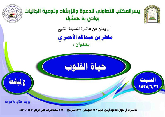 ينظم المكتب التعاوني للدعوة والإرشاد وتوعية الجاليات بوادي بن هشبل، محاضرة للشيخ ماطر بن عبدالله الأحمري، بعنوان “حياة القلوب” في جامع تباشعة بسهول بللسمر، بعد مغرب السبت المقبل، وتم تخصيص مكان للنساء.