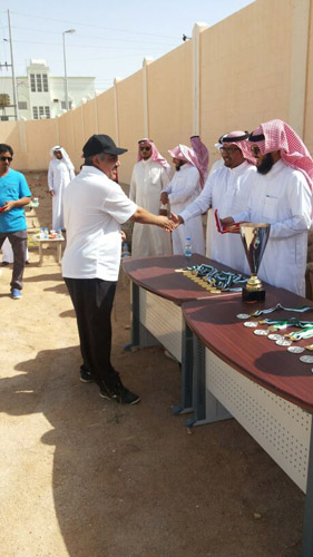 وسلم مدير مكتب التربة -ذياب فراج الدخيل- ومشرف التربية البدنية -معزي مشعان- الكأس والميداليات الذهبية لصاحب المركز الأول، والميداليات الفضية لصاحب المركز الثاني.
