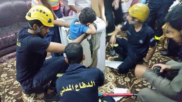 تمكنت فرقه إنقاذ من إدارة الدفاع المدني بمدينة تبوك مغرب هذا اليوم السبت من تحرير طفل عمره 3 سنوات احتجز في نشافة مغسلة ملابس في منزل والده بحي الفيصلية، وقد تمكنت من فك احتجاز الطفل في مدة عشر دقائق وحالته سليمة- ولله الحمد-، حيث تم الكشف عليه من قبل الهلال الأحمر الموجود في الموقع.