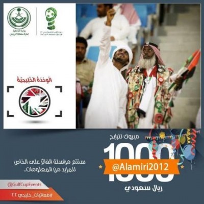 أعلن حساب فعاليات “خليجي 22” عن الفائز بجائزة ألف ريال، وذلك عبر مسابقة “أحلى صورة معبرة عن الوحدة الخليجة”، عن طريق برنامج “الانستقرام”، حيث ربح المتسابق ALAMIRI2012، بعد قيامه بالتقاط صورة لمشجع كبير في السن في إحدى المباريات.