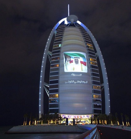 يشار إلى أن برج العرب في دبي تزيّن بصور أمير الكويت الأمير صباح الأحمد الصباح، بمناسبة اليوم الوطني الكويتي.