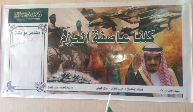 وقالت المعلمة عبير المقبل: إن “إحساسي بالمسؤولية تجاه وطني هو ما دفعني للمبادرة بتفعيل برنامج عن عاصفة الحزم مع زميلتي منال العوفي، هذه العاصفة التي أثلجت صدورنا وأطفت لهيبها لما أحسسنا معها معنى العز والكرامة تحت راية التوحيد وحكم مليكنا الغالي”.