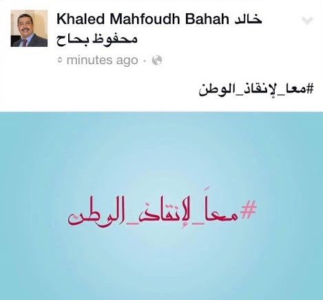 أطلق نائب رئيس الجمهورية اليمنية رئيس مجلس الوزراء خالد بحاح على صفحته في الفيسبوك هاشتاق #معاً_لإنقاذ_الوطن .