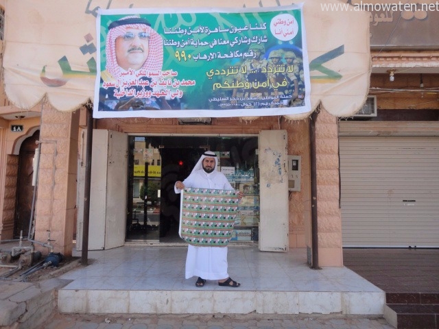وأضاف أنه تم توزيع ملصقات كتب عليها «أمن وطني أمني أنا» وزينت بصورة صاحب السمو الملكي ولي العهد ووزير الداخلية الأمير محمد بن نايف بن عبد العزيز ال سعود ووضع رقم مكافحة الإرهاب 990 وكتب عليها أيضا أنا عين ساهرة لأمن وطني.