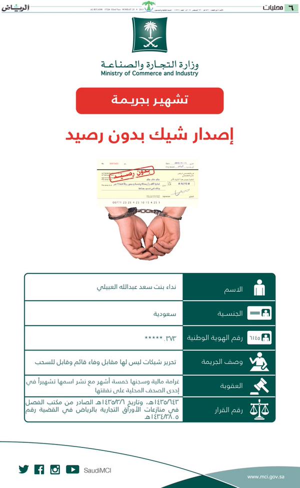 #التجارة تعاقب مواطنة أصدرت شيكاً بدون رصيد