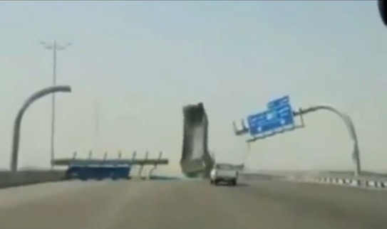 أظهر فيديو لقطات مروعة لسائق شاحنة يحطم لوحة علامات المرور المعلقة في الطريق السريع ، برفعه الجزء الخلفي للشاحنة.