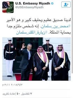 قالت السفارة الأمريكية بالرياض عبر حسابها بتويتر تعليقاً على زيارة خادم الحرمين الشريفين الملك سلمان بن عبدالعزيز أن لدينا صديق عظيم وحليف كبير وهو الأمير محمد بن سلمان ولي ولي العهد النائب الثاني لرئيس مجلس الوزراء وزير الدفاع .