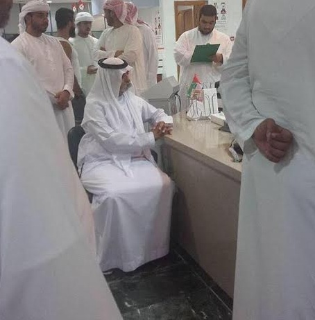 تداول مغردون من الإمارات، صورة لوزير الثقافة والشباب لتنمية المجتمع في الإمارات نهيان بن مبارك آل نهيان، وهو يتقدم حشد المواطنين للتبرع بالدم لجرحى القوات المسلحة في أبو طبي.