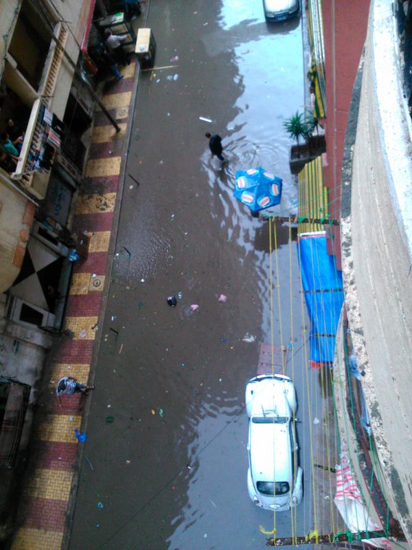 وتداول مغردو مواقع التواصل صورًا لمستنقعات المياه التي ملأت الشوارع وأغرقت المحال التجارية في مدينة الإسكندرية الساحلية.