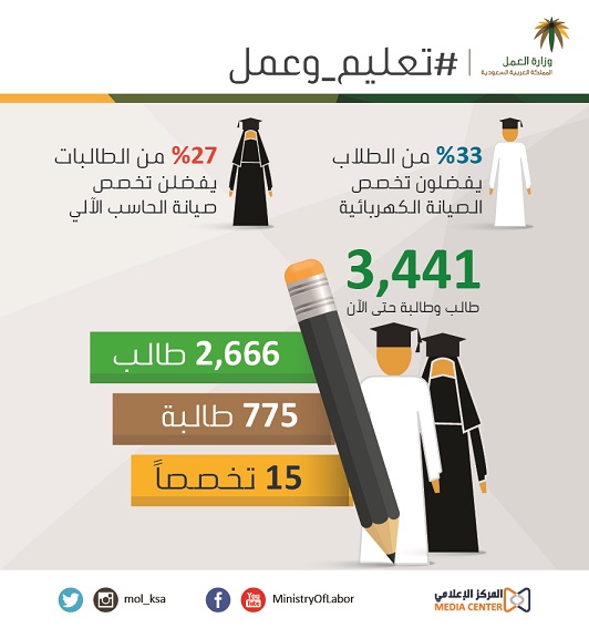 تواصل وزارة العمل والمؤسسات الشقيقة، أبرزها “المؤسسة العامة للتدريب التقني والمهني، وصندوق تنمية الموارد البشرية، والمؤسسة العامة للتأمينات الاجتماعية”، دعم 3441 من طلبة المرحلة الثانوية، بينهم 775 طالبة؛ لاكتشاف ميولهم وقدراتهم وتشجيعهم على الالتحاق بالتخصصات المهنية والتقنية التي يحتاجها سوق العمل.