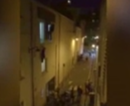 وشوهد في المقطع المصور تعلق بعض الأشخاص بنوافذ المسرح في الأدوار العليا هروباً من إطلاق النار الذي نفذه أحد المسلحين ضمن هجمات عدة شهدتها العاصمة باريس أمس الجمعة.