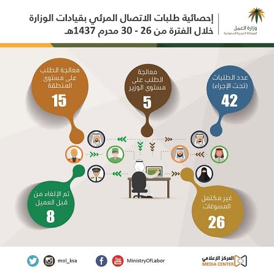تمكنت وزارة العمل من حل 20 طلباً وَرَدَتها عبر خدمة الاتصال المرئي من مختلف مناطق المملكة في خمسة أيام عمل؛ حيث أنهى معالي وزير العمل الدكتور مفرج بن سعد الحقباني 5 طلبات عبر الخدمة التي تُمَكّن العميل من الالتقاء بقيادات الوزارة؛ فيما تم التعامل مع الطلبات الـ15 الباقية من قِبَل مديري الفروع؛ في الوقت الذي لا يزال فيه 42 طلباً تحت الإجراء، مقابل 26 طلباً لم تكتمل بعد.