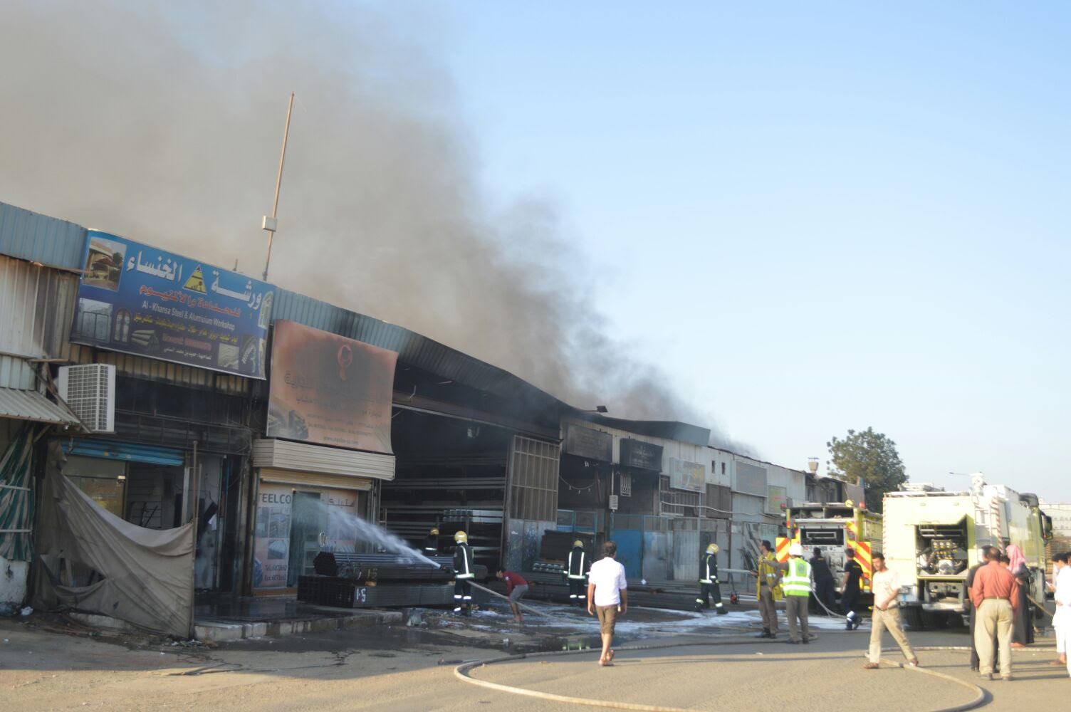 وأضاف سرحان “عند وصول الفرق لموقع الحادث عملت على إخلاء منطقة الحريق من العمالة؛ حفاظاً على سلامتهم ومزامنة مع أعمال الإنقاذ في الإخلاء، وقامت فرق الإطفاء على إخماد الحريق من الجهة الجنوبية والشمالية، مستخدمة الفروع الأرضية والقواذف من صهاريج المياه المتطورة، مستخدمة مادة الرغاوي في عملية الإطفاء”.