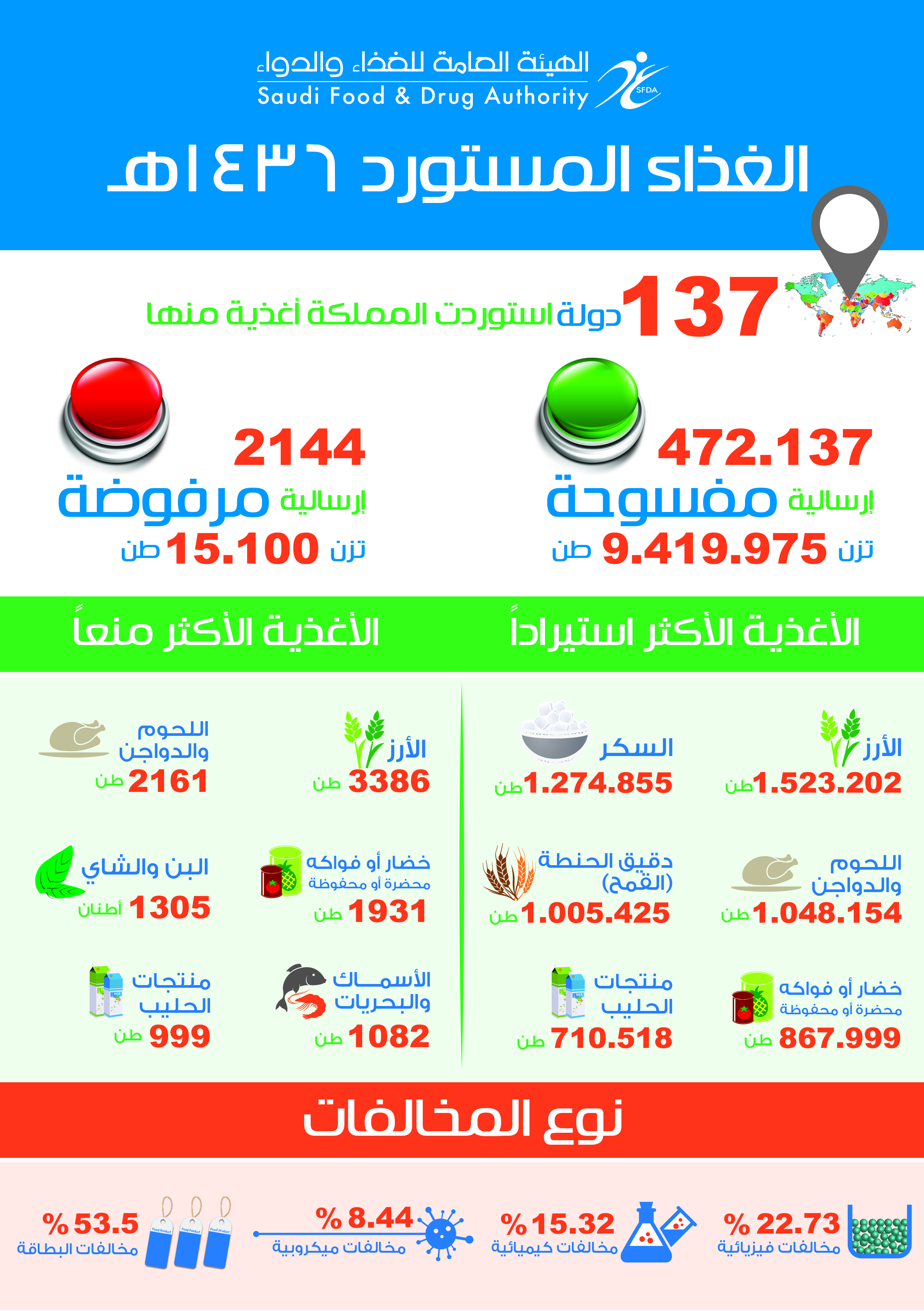 واستوردت المملكة أغذية من 137 دولة خلال العام الماضي (1436هـ)، وتبين أن نحو نصف وزن الأغذية التي تم استيرادها من الأرز، والسكر، واللحوم والدواجن، والدقيق.