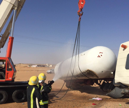 وتابع: شارك بالحادث فرقة من الدفاع المني بمحافظة وادي الدواسر، وتواجد بالموقع دوريات أمن الطرق والدوريات الأمنية التي قامت بتعديل مسار الطريق ومتابعة الوضع، وتم تمرير البلاغ لشركة الغاز بالمنطقة للتعامل مع الناقلة، حيث وصل للموقع عدد تريلتين للتفريغ تابعة للشركة وطاقم تفريغ وآليات مساندة؛ حيث إن سعة الناقلة 30 ألف لتر مكعب، وتم الانتهاء من التفريغ وتعديل مسار الناقلة وإجراء عملية التبريد.