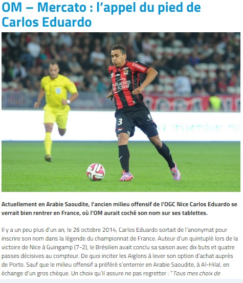 قالت إحدى الصحف الفرنسية “butfootballclub”: إن اللاعب كارلوس إدواردو- نجم الهلال- قد دفن نفسه عندما انتقل للهلال الصيف الماضي، مضيفةً أنه حقق أرقامًا أدخلته تاريخ الكرة الفرنسية، عندما كان مع نيس معارًا من قبل بورتو، وأن اللاعب كان لديه عروض من أندية عدة، لكنه اختار الهلال.