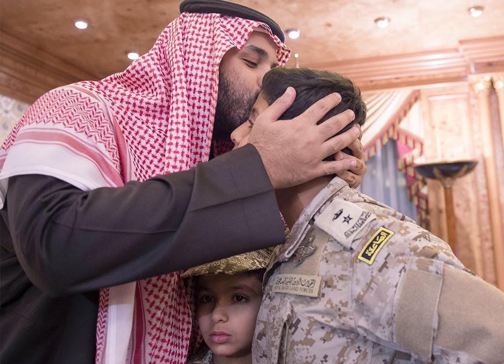 طبع ولي ولي العهد وزير الدفاع الأمير محمد بن سلمان السعودي قُبلةً أبوية على جبين ابني الشهيد البطل العقيد عبدالله السهيان قائد القوات السعودية الخاصة في عدن، والذي استشهد في اليمن الأسبوع الماضي.