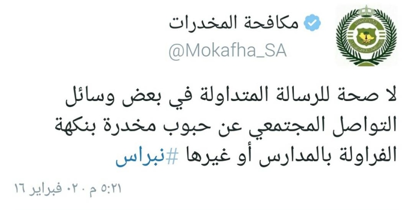 وقالت مكافحة المخدرات في تغريده عبر حسابها الرسمي بـ”تويتر”: “لا صحة للرسالة المتداولة في بعض وسائل التواصل المجتمعي عن حبوب مخدرة بنكهة الفراولة بالمدارس أو غيرها”.