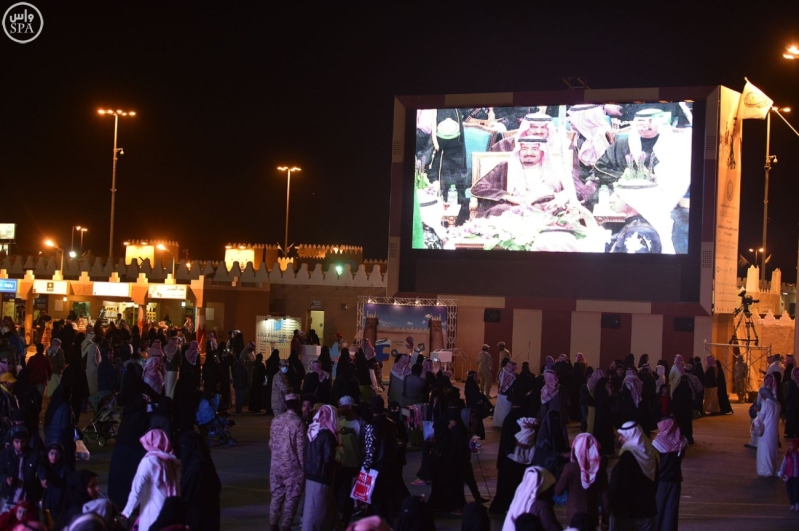 شاهد أعداد من زائري المهرجان الوطني للتراث والثقافة “الجنادرية 30″، على شاشة العرض التي نقلت في بث حي ومباشر عبر التلفزيون السعودي حفل العرضة السعودية التي رعاها مساء اليوم خادم الحرمين الشريفين الملك سلمان بن عبدالعزيز آل سعود (حفظه الله)، بحضور أصحاب السمو الملكي الأمراء، وضيوف المهرجان، وذلك في الصالة الرياضية بالدرعية.