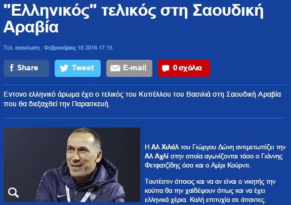 قالت صحيفة “contra” اليونانية: إن نهائي كأس ولي العهد السعودي الذي سيقام مساء اليوم بين الهلال والأهلي سيكون بنكهة يونانية؛ نظرًا لتواجد المدرب جورجيوس دونيس مدرب الهلال، واللاعب إيوانيس فيتفازيديس لاعب الأهلي.