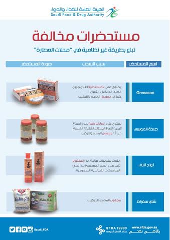 وأوضحت الهيئة أن بعض المستحضرات تحتوي على مواد تسبب تشوه الجنين، وتتنوع تلك المستحضرات التي تحاول الجهات التي صنعتها إغراء المستهلك باقتنائها، إذ تجد منها كريمات أو كحل أو لصقات أو شراب أو صابون أو بودرة أو دهن أو زيوت أو أعشاب أو عسل أو شامبو.