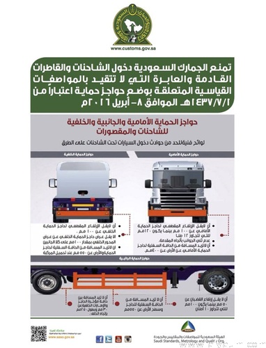 وقال المستشار والمتحدث باسم الجمارك السعودية- عيسى العيسى- إنه وبالتنسيق مع الهيئة السعودية للمواصفات، والمقاييس والجودة- تم وضع آلية لتنظيم وتطبيق اللوائح الفنية السعودية الخاصة بالحواجز في الشاحنات والمقطورات طبقًا للمواصفة رقم “2012:SASO GSO2112” –السيارات- حواجز الحماية الأمامية للشاحنات وطرق اختبارها، وكذلك المواصفة رقم “2012:SASO GSO2113” –السيارات- حواجز الحماية الجانبية للشاحنات والمقطورات وطرق اختبارها والمواصفة رقم “2012:SASO GSO2114 ” السيارات- حواجز الحماية الخلفية للشاحنات والمقطورات وطرق اختبارها، والصادرة من الهيئة السعودية للمواصفات والمقاييس والجودة.