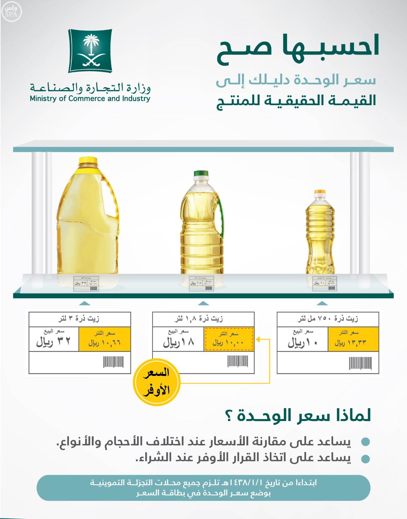 أصدرت وزارة التجارة والصناعة قراراً وزارياً يعتمد أحكام وضع سعر الوحدة الذي يسهل على المستهلك المقارنة بين منتجات الشركات المتنوعة بأوزان وأحجام مختلفة، وذلك عبر اعتماد آلية مقارنة موحدة توضع على بطاقة السعر تبين سعر اللتر أو الكيلو الواحد مما يسهل على المستهلكين اتخاذ قرارات الشراء ويزيد من المنافسة بين الشركات التي تعمد الى تغيير أوزان وأحجام منتجاتها لتفادي إمكانية مقارنة أسعارها مع المنتجات المنافسة.