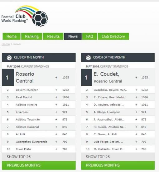 واحتل صدارة الأقوى في العالم عن شهر مايو، فريق بايرن ميونيخ بطل الدوري الألماني برصيد 1282، يليه ريال مدريد وصيف الدوري الإسباني برصيد 1036.