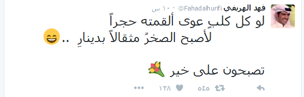 وقال في تغريدة لمتابعيه: “لو كل كلبٍ عوى ألقمته حجراً لأصبح الصخرُ مثقالاً بدينارِ .. تصبحون على خير”، فيما علق المريسل بقوله: “ما له داعي البلوك، قول أرفض المواجهة وبس . سأنتظرك أيضاً فالموسم انتهى والنصر خسر، تحياتي”.