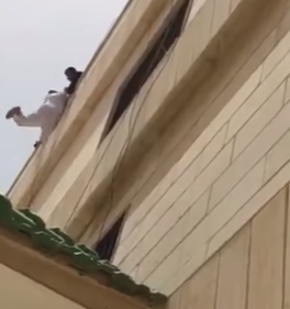 ويوضح الفيديو الذي تم تصويره من شرفة أحد العقارات المجاورة، لحظة مكافحة الشاب، لتفادي السقوط بعد صعود فرق الدفاع المدني له لمساعدته.