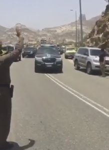 أظهر مقطع فيديو متداول وقوف رجل أمن في الشارع مؤديًا التحية لزملائه أثناء مرور دورية أمنية يبدو أنها متجهة لتنفيذ عملية أمنية.