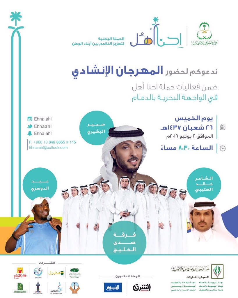 جدير بالذكر، أن المهرجان الإنشادي يُقام الليلة على الواجهة البحرية بمدينة الدمام، ويشارك فيه المنشد سمير البشيري، وفرقة صدى الخليج، والنجم عيد الدوسري ،عند الساعة ٨:٣٠ م.