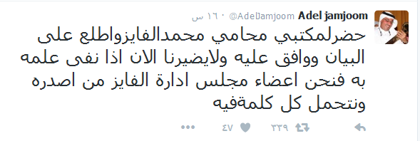 ونشر جمجوم تغريدة عبر حسابه الشخصي على موقع تويتر، قال فيها: “حضر لمكتبي محامي محمد الفايز واطلع على البيان ووافق عليه، ولا يضيرنا الآن إذا نفى علمه به، فنحن أعضاء مجلس إدارة الفايز من أصدره ونتحمل كل كلمة فيه”.