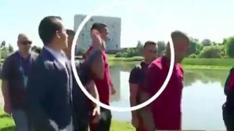 وبدلاً من أن يجيبه رونالدو، قام النجم البرتغالي بتصرف عنيف معه، حيث أمسك بقوة بالميكروفون ثم ألقاه في البحيرة.
