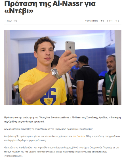 كشفت تقارير صحفية قبرصية أن إدارة نادي أبويل رفضت عرض إدارة نادي النصر السعودي لضم صانع ألعاب الفريق توماس دي فينسيتي، خلال فترة الانتقالات الصيفية الحالية.