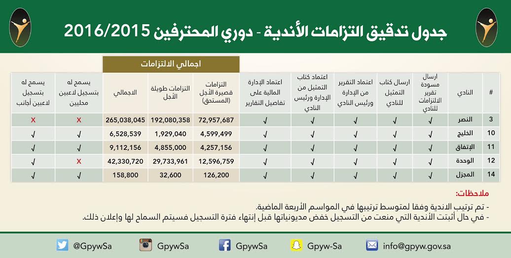 ونشرت هيئة الرياضة، جدول تدقيق التزامات الأندية بدوري عبداللطيف جميل للمحترفين 2015/2016، وتبين منه عدم قدرة نادي النصر، على تسجيل لاعبين سواء محليين أو أجانب، وبلغت التزاماته قصيرة الأجل (72.957.687)، فيما وصلت التزاماته طويل الأجل لـ(192.080.358).