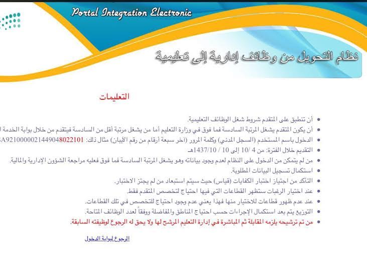 وتنُص الشروط؛ على أن يكون المتقدم للنقل منبطقاً عليه شروط الوظائف التعليمية، وأن يكون على المرتبة السادسة فما فوق.