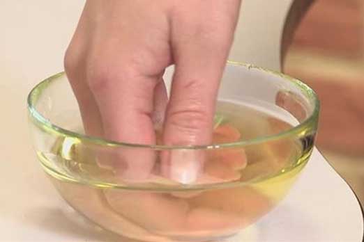 امزجي ثلاث ملاعق صغيرة زيت زيتون وخل تفاح مع صفار بيضة، ضعي الخليط في الثلاجة ، استخدمي قطعة صغيرة من القطن لدهن الأظافر بالكريم ويكرر بشكل يومي.