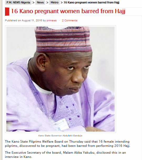 قالت صحيفة “بي إم نيوز نيجيريا” النيجيرية: إن مكتب رعاية حجاج ولاية كانو أعلن الخميس عن أن 16 امرأة تم اكتشاف حملهن منعن من أداء حج هذا العام.