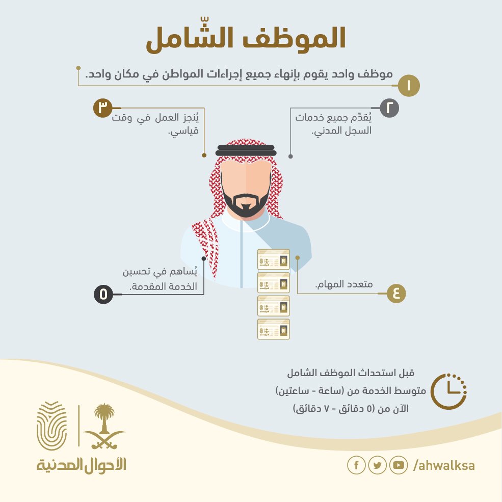 وقالت الاحوال المدنية عبر حسابها على تويتر : حرصًا منّا على خدمتك بشكل سريع، استحدثنا مفهوم الموظف الشامل.
