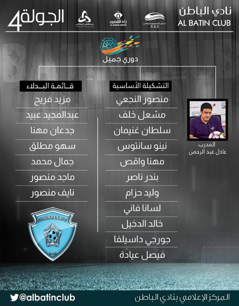 أعلن المدير الفني لنادي الباطن، المصري عادل عبدالرحمن، تشكيلة الفريق التي ستواجه الاتفاق، بعد قليل، ضمن منافسات الجولة الرابعة من دوري عبداللطيف جميل للمحترفين.
