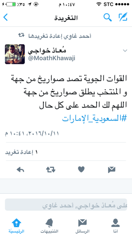 وقال المغرّدون إن القوات السعودية تصدّ صواريخ من جهة والأبطال يطلقونها من جهة أخرى للانتصار في مواجهة الأشقاء في المنتخب الإماراتي.