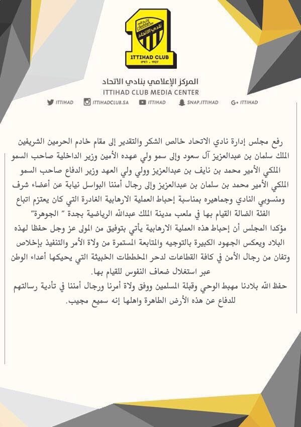 بعد أن أعلنت وزارة الداخلية عن القبض على مستهدفي ملعب ”الجوهرة“ بمدينة الملك عبد الله الرياضية، في محافظة جدة، أثناء مباراة منتخبي المملكة العربية السعودية ودولة الإمارات العربية المتحدة الشقيقة، التي أُقيمت يوم الثلاثاء الموافق 10/ 1/ 1438هـ، أصدر ناديا الاتحاد والأهلي بيانَيْن؛ إشادةً برجال الأمن الذين تمكَّنوا من إحباط العملية الإرهابية التي كان يعتزم الفئة الضالة القيام بها في ملعب الجوهرة.