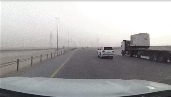 وأظهر مقطع فيديو وثّقه أحد الشباب، سائق سيارة من نوع تويوتا يارس وهو يقود بسرعة عالية ليفاجأ بشاحنة تقطع الطريق، ليقوم الشاب بتفادي الاصطدام والابتعاد عنها.