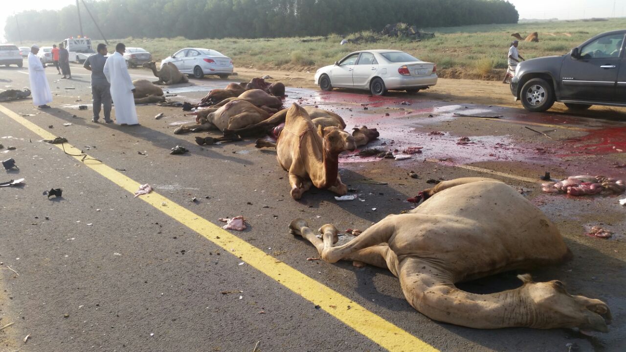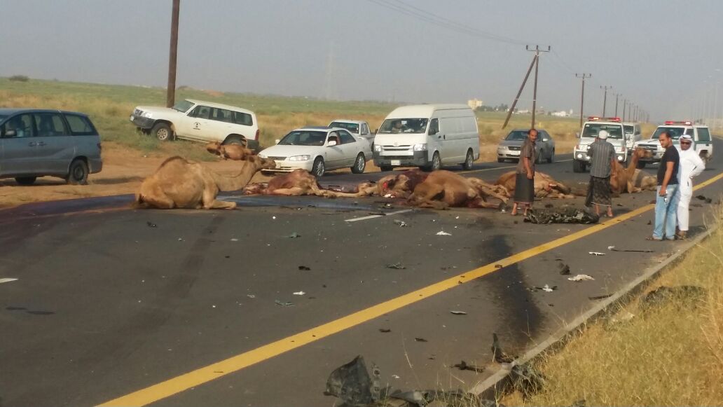 تسبب قطيع من الإبل السائبة في وقوع حادثي تصادم لمركبتين من نوع مازدا وأكسنت، على الطريق الدولي الرابط بين مدينة جيزان ومحافظة أحد المسارحة، ونتج عن الحادث الأول إصابة حرجة لقائد المركبة، بينما تعرض قائد المركبة الأخرى لإصابة بسيطة.