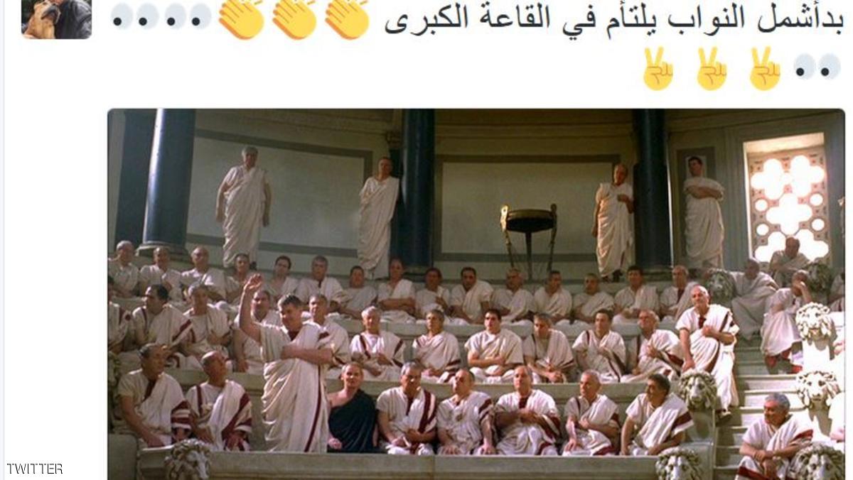ونشر جنبلاط، ثلاث تغريدات، لثلاث صور لنواب من العهد الروماني، أثناء دخولهم البرلمان، وأثناء استعدادهم للجلوس، وأثناء عملية التصويت لاختيار الإمبراطور، مثل ما نشاهد في الأفلام السينمائية، عن الحقبة الرومانية.
